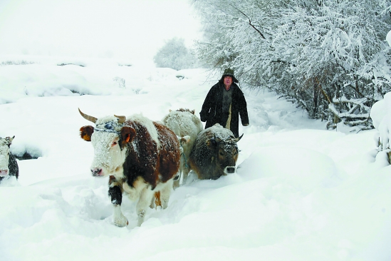 12月27日,新疆阿勒泰市切木尔切克乡牧民在风雪中赶牛。新疆气象台发布暴雪蓝色预警,27日白天到28日白天,新疆将迎来又一次降雪天气,其中新疆北部的塔城、阿勒泰地区将有中到大雪,局部地区可达暴雪。 新华社发(叶尔江 摄)