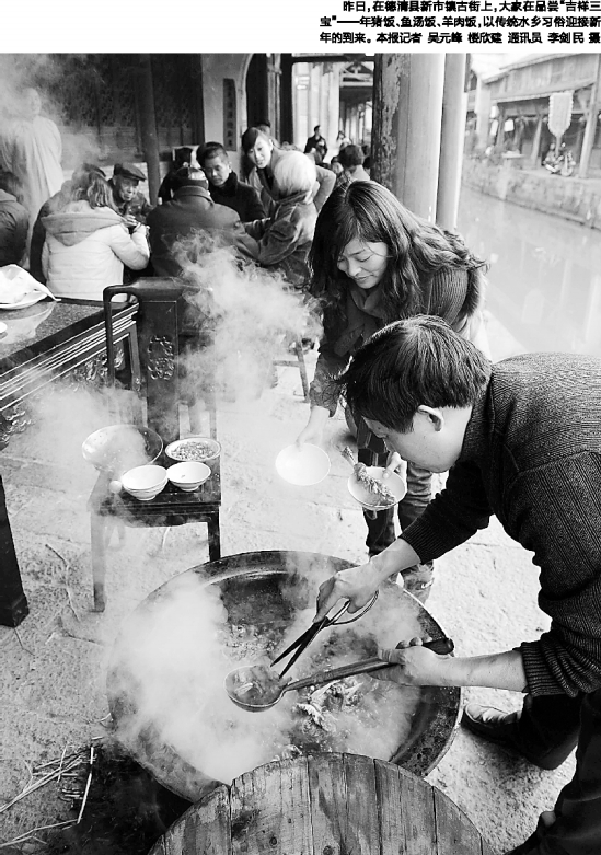 昨日,在德清县新市镇古街上,大家在品尝“吉祥三宝”——年猪饭、鱼汤饭、羊肉饭,以传统水乡习俗迎接新年的到来。本报记者 吴元峰 楼欣建 通讯员 李剑民 摄