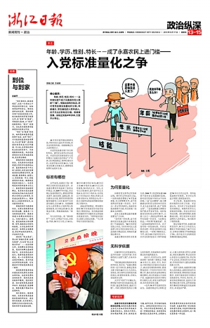 《入党标准量化之争》一文,刊登在6月17日的政治周刊上。当天,我在平阳出差,一大早就接到一个来自永嘉的电话:“不好了,你的稿子出大事了!”原来,一大早,省委常委、组织部长蔡奇一看到报道,就作出批示。