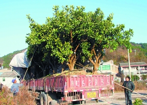 12月27日,玉环县干江镇断岙村一文旦园里,民工们在挖文旦树。据介绍,这块果园将作他用,宁波客人闻讯买下这100多株成果文旦树,准备移植到宁波。