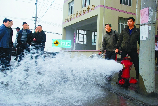 自来水通到黄门村口,村干部打开消防栓试水。 骆战红 摄