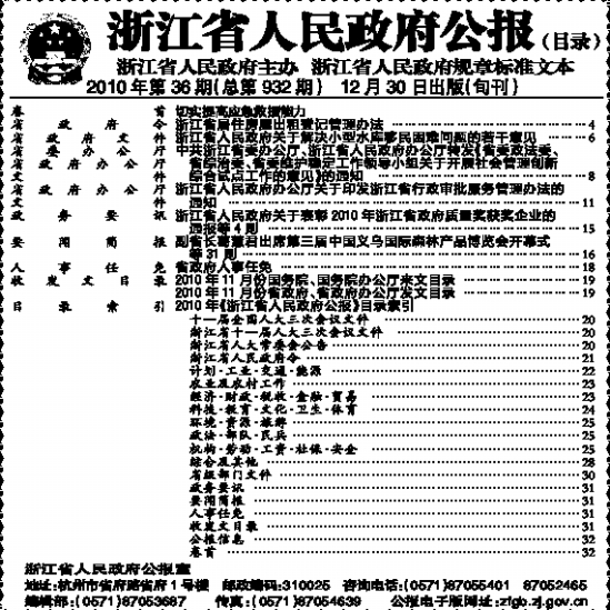 2010年《浙江省人民政府公报》目录索引