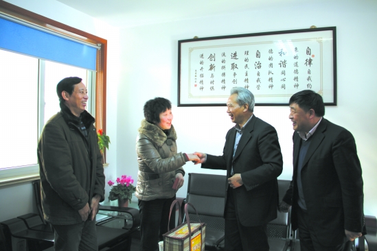 国土资源部日前通报表扬全国501名地质灾害防治优秀群测群防监测员,杭州市萧山区万寿桥社区书记王慧英被评为全国“十大杰出监测员”。1月25日,省国土资源部门有关负责人来到社区看望慰问王慧英(女)。李风 摄