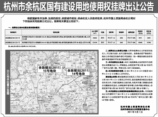 五、本次挂牌出让详细资料请参阅挂牌出让文件。有关挂牌出让文件资料可于2011年2月14日起到杭州市余杭区公共资源交易中心(余杭区临平南大街265号时代广场市民之家三楼)L8号窗口索取。