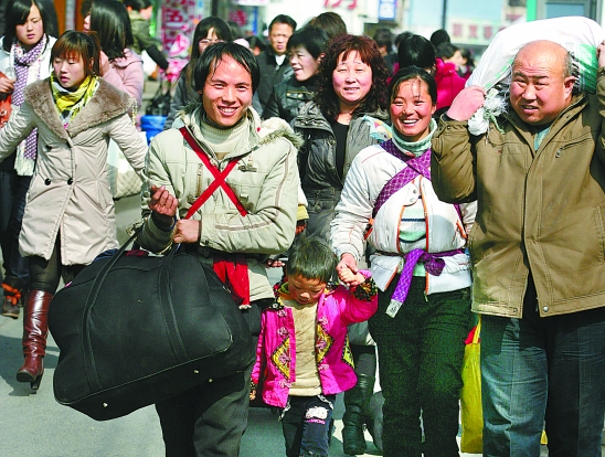 昨日中午,来自云南的杨荣财(前左一)和妻子赵飞红(前右二)快乐地走出杭州火车站。他们夫妇俩带着孩子和众多行李,转车去慈溪市做“反季”民工。