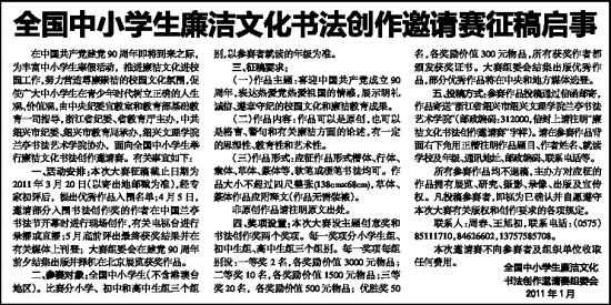 在中国共产党建党90周年即将到来之际,为丰富中小学生寒假活动,推进廉洁文化进校园工作,努力营造尊廉崇洁的校园文化氛围,促使广大中小学生在青少年时代树立正确的人生观、价值观,由中央纪委宣教室和教育部基础教育一司指导,浙江省纪委、省教育厅主办,中共绍兴市纪委、绍兴市教育局承办,绍兴文理学院兰亭书法艺术学院协办,面向全国中小学生举行廉洁文化书法创作邀请赛。有关事宜如下: