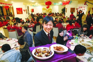 | 1月31日,杭州某酒店年夜饭上,主管在为员工服务。屠春 摄 |