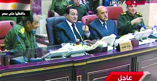 这张1月30日的电视截图显示,埃及总统穆巴拉克(左二)在开罗会见军政高层人士。 新华社发