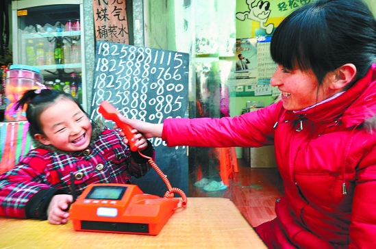 2月2日,杭州湖州路一公用电话房前,一名孩子打电话给河南老家的姥姥拜年。