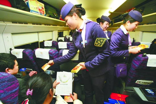 2月2日,在D5681次动车上,列车员给旅客送兔年贺卡,唱新春祝福歌,祝大家平安回家。