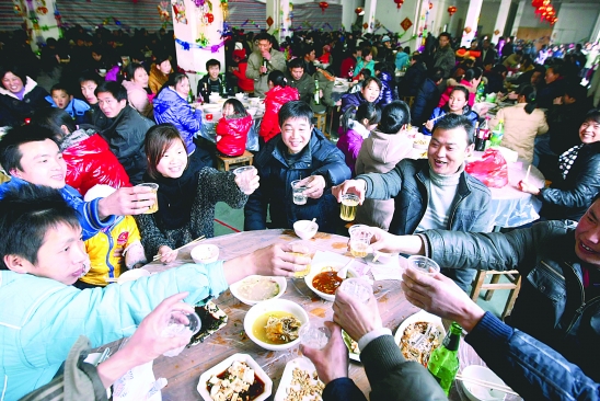 2月2日,诸暨一家公司准备了丰盛的年夜饭,招待800多名员工及其家属,欢聚一堂共迎新年。郭斌 摄