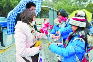 他们不是瞅准了情人节商机的小贩,也不是在卖玫瑰花,他们义卖的是热心网友捐赠的布制玫瑰。这群年轻人是杭州市慈善总会杭州网义工分会的义工们。