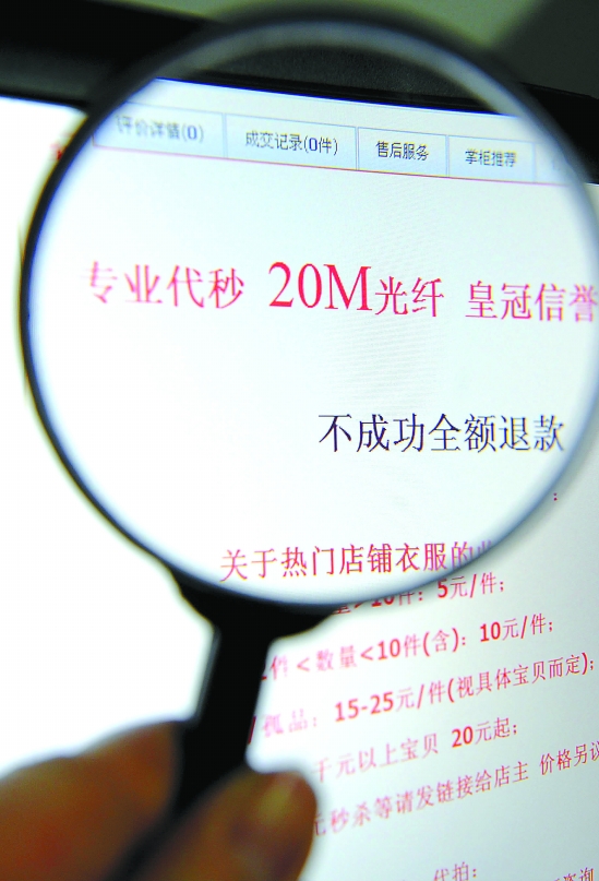 网上一些专业“代秒”店铺甚至打出“不成功全额退款”的广告(2月13日摄)。 新华社记者 公磊 摄