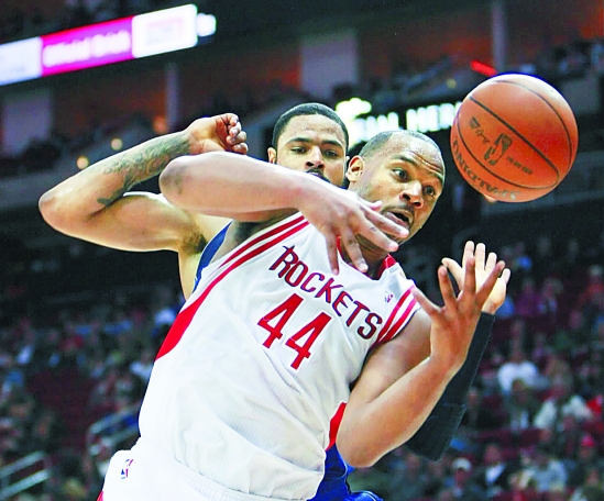 火箭队球员海耶斯(前)在比赛中拼抢。新华社发