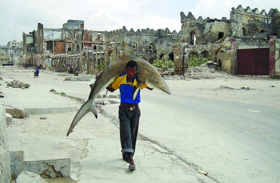 索马里摄影师奥马尔·费萨尔2010年9月23日拍摄的照片获得荷赛日常生活类单幅一等奖。照片说明为“一名男子背着鲨鱼走在索马里首都摩加迪沙街头”。 新华社发