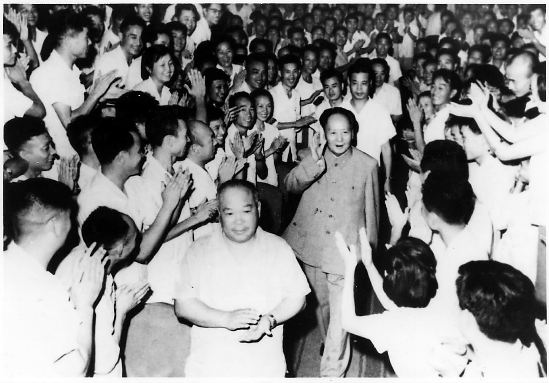 1961年7月17日,江华陪同毛泽东主席在杭州人民大会堂接见出席浙江省三级干部会议的代表。