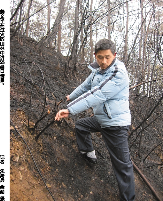 姜文平在过火的山林中讲述当日情景。 记者 朱海兵 余勤 摄