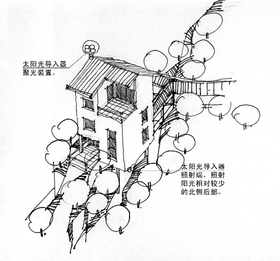 借助太阳光导入器技术,通过设在屋顶的太阳光导入器聚光装置,收集太阳光,再将太阳光沿高纯度大直径石英光导纤维输送到建筑物底层的照射端,以保证林木成活。太阳光照明导入技术已日益成熟。