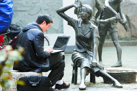 2月24日,杭州中山北路上,一位小伙子专心低头上网,全然不顾一旁的“女孩”等得不耐烦。本报记者 李震宇 通讯员 郭奕麟 摄