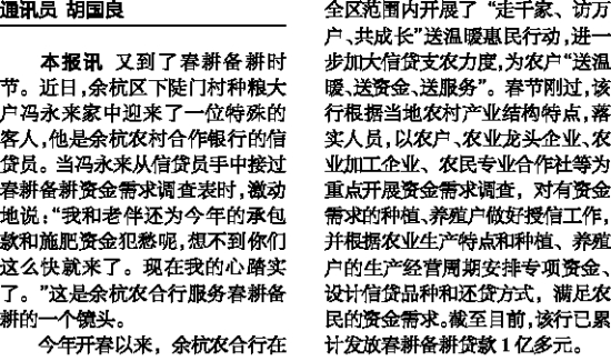 本报讯 又到了春耕备耕时节。近日,余杭区下陡门村种粮大户冯永来家中迎来了一位特殊的客人,他是余杭农村合作银行的信贷员。当冯永来从信贷员手中接过春耕备耕资金需求调查表时,激动地说:“我和老伴还为今年的承包款和施肥资金犯愁呢,想不到你们这么快就来了。现在我的心踏实了。”这是余杭农合行服务春耕备耕的一个镜头。