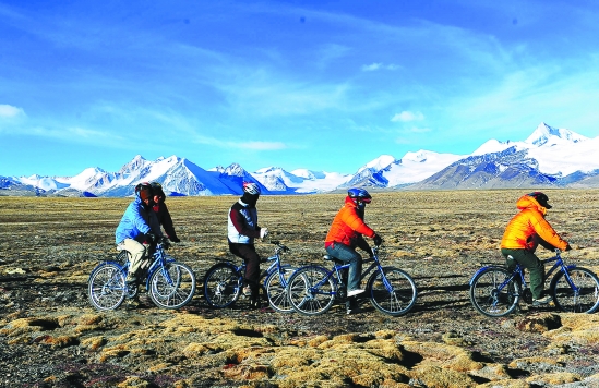 2月24日,户外运动爱好者们在各拉丹冬山脚下的湿地上骑行。当日,长江源头体育旅游探险活动在青海省海西蒙古族藏族自治州境内的各拉丹冬山脚下举行。来自北京、青海等地的20名户外运动爱好者在平均海拔5000米以上的湿地中进行了自行车骑行、徒步探险、放飞热气球等3项活动。 新华社发