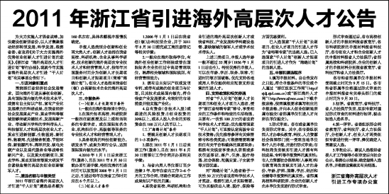 为大力实施人才强省战略,加快建设创新型省份,以人才集聚推动经济转型发展、科学发展,根据省委、省政府《关于大力实施海外优秀创业创新人才引进计划的意见》、《浙江省“海外高层次人才引进计划”暂行办法》,现就今年实施省海外高层次人才引进“千人计划”有关事项公告如下: