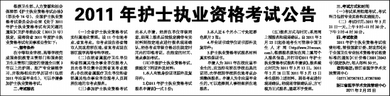 根据卫生部、人力资源和社会保障部《护士执业资格考试办法》(部长令74号)、全国护士执业资格考试委员会办公室《关于2011年护士执业资格考试有关问题的通知》(卫护考委办发〔2011〕1号)规定,现将我省2011年度护士执业资格考试有关事项公告如下: