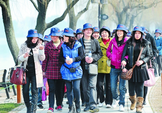 昨日,杭城暖阳高照,上虞市飞阳灯头有限公司包租两辆旅游大巴,送80多名员工来西湖春游。 本报记者 吴元峰 摄