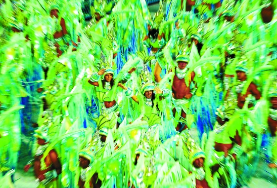 3月5日,在巴西里约热内卢,参加桑巴巡游的演员在桑巴大道上表演。巴西里约狂欢节正式进入成人组桑巴巡游阶段,共有11个甲级桑巴舞学校参加了当日的巡游。 新华社记者 宋为伟 摄
