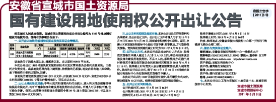 四、公开出让方式:本次公开出让地块的出让方式为:取得竞买资格的申请人超过2人(含2人)以上的,将公开拍卖该宗地块国有建设用地使用权。不足2人的,采取挂牌方式进行,同时将竞买申请及竞买保证金的到账时间顺延至2011年4月6日16时。挂牌截止时有竞买人表示愿意继续竞价,转入现场竞价。具体的公开出让方式,将于2011年3月29日12时前由宣城市招投标中心告知取得竞买资格的申请人。