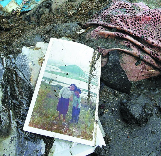 3月14日,一张照片静静地“躺”在日本重灾区宫城县东松岛市的废墟上。 新华社发