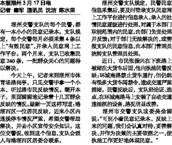 湖州市交警支队政委吴金满说:“可别小看民意记录本,反映上来的问题,我们会认真对待,妥善解决,并作为决策的主要依据之一,使执法工作更好地体现民意。”