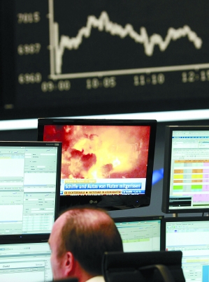 | 证券交易所大屏幕正在播放日本地震图像。东方IC供图 |