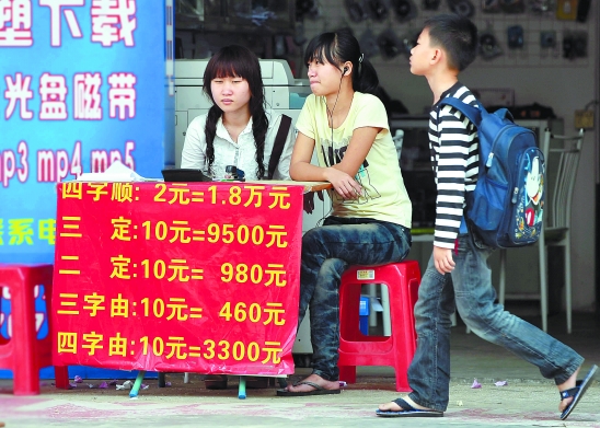 3月15日,一名学生从文昌中学周边贩卖“私彩”的摊点前走过。 新华社记者 郭程 摄
