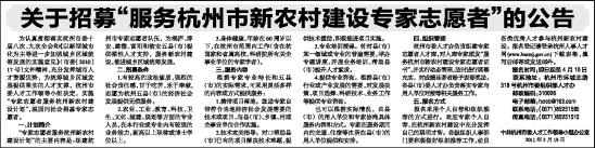 关于招募“服务杭州市新农村建设专家志愿者”的公告