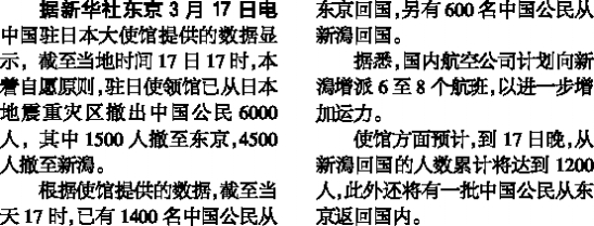使馆方面预计,到17日晚,从新澙回国的人数累计将达到1200人,此外还将有一批中国公民从东京返回国内。