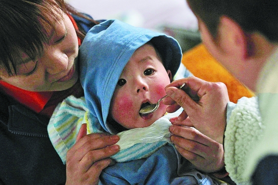 3月17日,一名妇女在避难所内给孩子喂食。 新华社发
