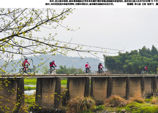 昨天,武义县环保局、县体育局组织近百名单车骑行爱好者组成低碳环保宣传队,前往武义县大田乡代石村等12个行政村,向村民发放环保宣传资料,讲解环保知识,倡导绿色低碳的生活方式。报道组 李小波 记者 徐贤飞 摄