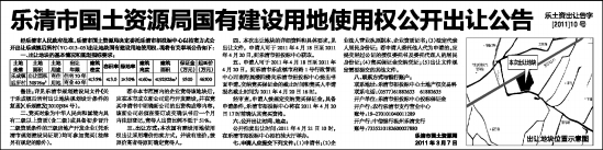 公开拍卖出让时间:2011年4月21日10时,在乐清市招投标中心招拍挂大厅举办。