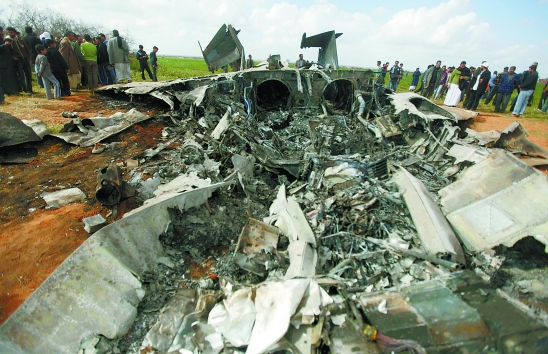 图为3月22日,在利比亚班加西附近,当地居民查看坠毁的美国战机。