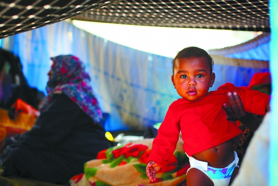 滞留在利埃边境的非洲难民儿童在简易帐篷里玩耍。 新华社记者 才扬 摄