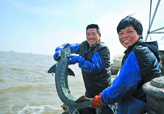 昨天上午,浙岭渔21318船将一条误捕的中华鲟运往温岭石塘镇蒜岛附近海域放生。这条中华鲟重27.6斤,长约1.34米,是29日下午捕获的。 朱海伟 王萍 摄