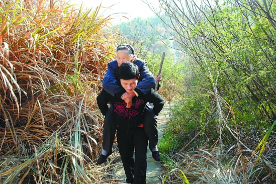 3月31日,外孙郑洁伟背着李香莲上山扫墓。
