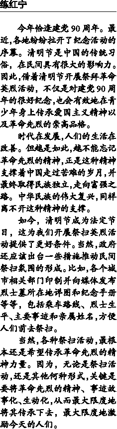 今年恰逢建党90周年。最近,各地纷纷拉开了纪念活动的序幕。清明节是中国的传统习俗,在民间具有很大的影响力。因此,借着清明节开展祭拜革命英烈活动,不仅是对建党90周年的很好纪念,也会有效地在青少年身上传承爱国主义精神以及革命先烈的崇高品格。