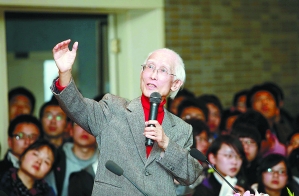 讲座的最后,83岁高龄的余老先生应学生一致要求,缓缓吟诵起了那首40年前写下的诗,熟悉的诗句响起,台下轻迎合声,坐在第一排的那位“新娘”眼里泛起了泪光。 (摄影:魏志阳)
