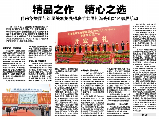 2011年3月27日,舟山驶出世界级家居航母,科来华国际广场红星美凯龙盛大开业。国家商务部、舟山市四套班子的领导,中国建材流通协会、中国建材市场协会的领导出席开业仪式,与该商场建立紧密合作关系的地产、家具、建材公司负责人,该商场经销商代表以及家居行业有关专业人士,浙江部分报刊、电视媒体记者等5000多人出席了庆典活动。