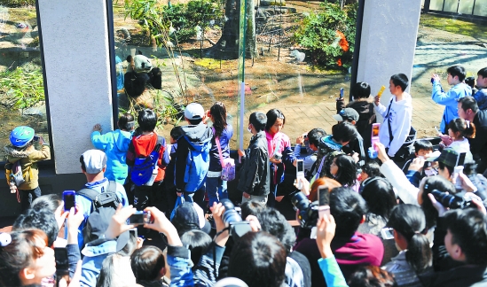 4月1日,在日本东京上野动物园,大熊猫“仙女”与观众见面。当日,中国大熊猫“比力”和“仙女”在上野动物园与观众首次见面,截止上午11时(当地时间),参观者达8000余人,预计首日将达到数万人。 新华社记者 季春鹏 摄