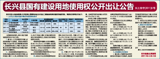 四、本次公开出让的详细资料和具体要求,见公开出让文件。申请人可于2011年4月8日至2011年4月25日(双休日除外),到长兴县雉城镇长海路361号长兴县招投标中心国土资源交易分中心获取出让文件。对于采用挂牌出让的宗地,申请人可继续于2011年4月26日至2011年5月11日到上述地点获取公开出让文件。