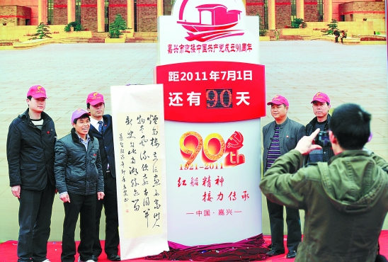 嘉兴市各界党员代表在计时牌前合影留念。本报记者 董旭明 摄