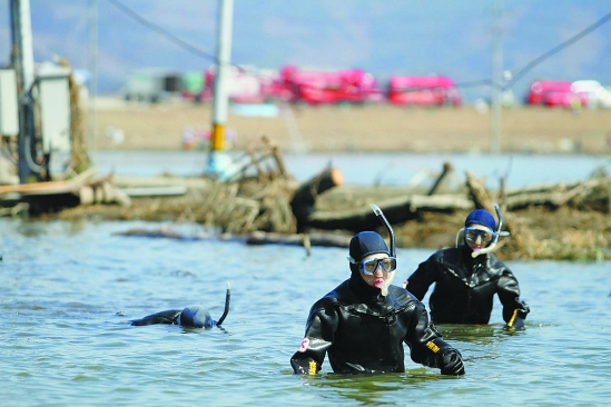 4月1日,搜救人员在日本宫城县搜索遇难者的遗体。 新华社发